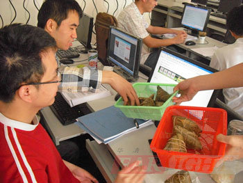 6月13日,上海中心的老師們一早就開始為學員熱粽子,發粽子。學員們吃著各種風味香噴噴的粽子討論著有關端午節的活動、習俗,還有端午節的來歷,以及屈原的的故事等等,所有的這些在濃濃粽香中飄動。。。。。。