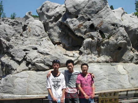 我們的大隊伍,沿著昆明湖前往十七孔橋,有時湖中的小魚把我們腳步拖住,有時在被同學稱之為“?菔癄”的景點前留下我們的合影,去見證這一“愛情至高無上的名言警句”,據說這“海枯石爛”俗名為“敗家石”,在乾隆年間,耗資巨大,將此石運到此處,但后因用處不大,扔至郊外。故取名為“敗家石”。