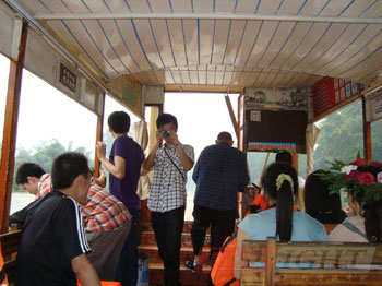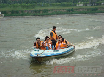 下午,從碼頭出發,我們開始了一段愜意與刺激并具的旅程。大家先是坐上客船,在兩岸綠蔭濃密的河道中乘風而行,貌似有蘇東坡的“清風徐來,水波不興”的點點意境,使得大家興奮不已,按捺不住地離開坐位與清風、水波,做親密的接觸,印下這大自然的恩賜,大家對它留戀之極,但還由不得我們盡情,船就靠岸了。岸上的金佛寺就是我們的目的地,走過一段盤山公路,我們就聽到了寺廟傳來念佛經的聲音,原來我們已經踏入了這佛門靜地。寺廟不是很大,但卻有一尊很大很大的佛像,帶著祈福的心,靜靜地參觀完寺廟完后,我們踏上了返鎮的客船。回到碼頭,我們開始瞄準了一項驚險刺激的項目——坐快艇!在來之前就有聽一位老師說過要玩過隱的項目,就非它莫屬了,果不其然,快艇上時時傳來的一陣陣尖叫聲,咱們的學員也按捺不住,穿好安全服上了快艇。急速行駛中的快艇表演讓艇上的人前俯后仰,左晃右蕩,驚魂未定,也讓岸上的觀眾同樣緊張兮兮,叫聲不斷,笑聲不停,一點兒沒閑……