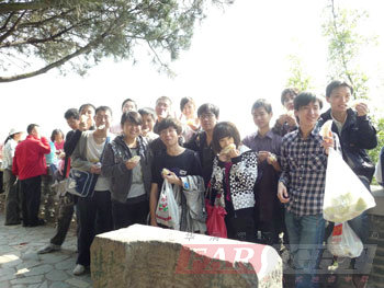 走著走著,在經(jīng)過一個(gè)陡坡之后,我們終于看到望兒臺(tái)。傳說楊六郎與遼兵曾在山下大戰(zhàn),佘太君登山觀戰(zhàn)為六郎助威,因此又叫“望兒山”。在“望兒臺(tái)”佘老太君的塑像前瞻仰時(shí),我們竟突然產(chǎn)生了一種濃郁的思鄉(xiāng)之情——盡管經(jīng)常在外面時(shí)時(shí)電話問候他們,但是秋天來了,天氣漸冷,不知道家鄉(xiāng)的父母現(xiàn)在一切還好嗎? 同學(xué)們簇?fù)碓谕巧希魍本惺軡M山的綠意。這時(shí)李守業(yè)同學(xué)提議大家一起吃柚子。一聽有柚子可吃,同學(xué)們的傷感情懷立刻煙消云散,開始焦急等待守業(yè)同學(xué)分柚子。經(jīng)過一番努力,同學(xué)們圍在一起開心地品嘗著這一絲清香,一絲甘甜。