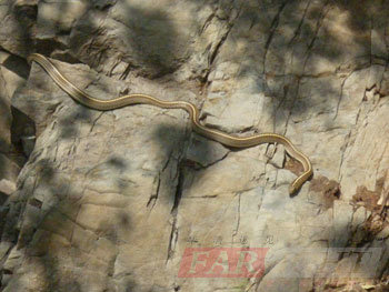 在爬山的過程,偶爾間發(fā)現(xiàn)前面有一群體正在研究什么,于是好奇的我們立刻跑過去觀看。原來是一條小青蛇掛在山間的巖石上,它很淡定,很從容。并沒有因?yàn)榇蠹业膰^而匆忙離去。依然是趴在那里,一動(dòng)不動(dòng),好奇的看著我們。一些膽小的女生,戰(zhàn)戰(zhàn)兢兢看著這條小青蛇。這時(shí)不知是哪位人士驚動(dòng)了一個(gè)螞蚱,飛到一個(gè)女同學(xué)身上,緊接著的連鎖反應(yīng),當(dāng)然是尖叫聲一片。跟著有人以為是老鼠在跑,由此引發(fā)一片混亂,驚叫連連!自此,本回秋游中經(jīng)典的螞蚱與青蛇的故事上演完畢!
