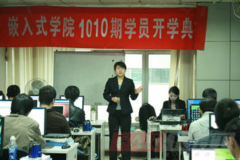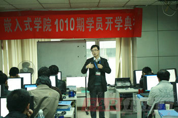 開學(xué)典禮第二項(xiàng)是由華清遠(yuǎn)見教育科技集團(tuán)院長季老師為開學(xué)典禮致辭,季老師對(duì)華清遠(yuǎn)見的企業(yè)文化以及也內(nèi)知名的合作企業(yè)情況都進(jìn)行了簡短的介紹,同時(shí)還專門通過對(duì)目前行業(yè)關(guān)注的熱點(diǎn)“物聯(lián)網(wǎng)”、“云計(jì)算”等實(shí)例的分析,讓大家更直接地感受到了嵌入式專業(yè)方向的優(yōu)勢(shì),季老師專門鼓勵(lì)新學(xué)員一定要努力學(xué)習(xí),充分調(diào)動(dòng)起自己的興趣以及積極性,在華清遠(yuǎn)見各位老師的幫助和指導(dǎo)下,真正達(dá)到學(xué)有所成,成為一名合格的嵌入式工程師。后季老師給每一位同學(xué)提出了五點(diǎn)希望,鼓勵(lì)大家都能夠找到適合自己的學(xué)習(xí)方法,達(dá)到有質(zhì)有量的學(xué)習(xí)。季老師的幾點(diǎn)希望包括:1、刻苦學(xué)習(xí),懂得吃苦;2、掌握學(xué)習(xí)方法,勞逸結(jié)合;3、有好的學(xué)習(xí)心態(tài),為自己而學(xué);4、遵守學(xué)院規(guī)章制度,為他人著想;5、通過合理渠道及時(shí)反應(yīng)問題等。