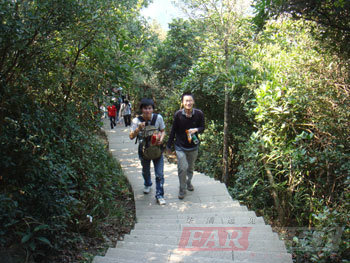 梧桐山是深圳河的發祥地,山高林密,鳥語清脆響徹耳邊,同時山茶花遍開山野,香氣襲人,爬山小徑上灑滿了從濃密的樹葉空隙里穿透下來的陽光斑點,點綴著路面,伴隨著上山、下山的人流,跳躍著,讓游人的腳步也輕松起來了。也許是太專注于學習而缺乏鍛煉,我們輕快的腳步越發的沉重起來,呼吸也變得急促了,聊天的歡笑聲也小了,開始感覺到每登一個階梯都比較吃力了。在半山腰就有同學發出疑問:“還有多高。俊迸赃叺耐瑢W給他鼓勁說:“快了,還有兩、三百級。我們休息一下,先補充一下能量。”大家一致同意,要勞逸結合,為了爬得更高,我們好好調整。于是,大家就在旁邊的空地,開始補充能量。休息了幾分鐘之后,大家的激情又回來了,相互鼓舞著:“走,上山!我們去征服這座高山!”。