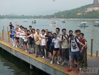 7月16日,華清遠見教育科技集團1104期全體學員,相約在頤和園正門的售票處集合。在前一天放學前,我們相約對于遲到的學員請大家吃雪糕。這是一個美麗的創意!在早晨8:10的時候,就看到有的同學已經來到這里,在翹首企盼中同學們在9點前都各就各位了,但仍有四位同學遲到。同學們非常興奮看著這幾位同學的到來,笑在嘴邊甜在心里——因為我們有雪糕吃了!呵呵! 9:10分,我們出發在頤和園正門合影,露出開心的笑容。大隊出發,前進,天氣很好,心情很好。