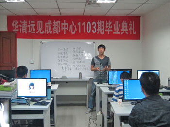 在班主任周老師的主持下,首先請上了成都中心負責人陶校長為本次典禮致辭。每次畢業典禮上,感慨激動的不僅是學員,老師們也一樣。這位可親可敬的校長,饒有興致地帶大家一起回顧了這四個多月。經歷,就像一場自己拍攝于寒冬時節的電影,再次重放時,歷歷在目,親切真實,但卻讓仲夏的人們,臉上洋溢了許多輕松與愜意,淡忘了創作時的艱辛。其間,陶老師對在座各位1103期學員在四個月中的堅持和努力付出給予肯定,同時向一路陪大家走過來的各位老師表示感謝,現場幾度響起了熱烈的掌聲,給老師也給1103期學員自己。后,面對即將離開華清走入企業,或是迎接企業檢驗的學員,陶老師希望大家保持良好的心態,迎接挑戰;通過今天答辯,大家的表現讓他相信接下來不管是工作還是就業,對在座各位1103期學員將又是一個展現自我,沉淀自我,提高自我的過程,希望大家以后常回華清遠的大本營相聚,歡迎大家常回來看看。