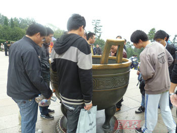 中間的一個平臺上有兩個銅鼎,其中一個上面有炮眼,據說是侵華日軍炮彈擊中的,這是整個中山陵唯一被戰火破壞的地方。大家都扎著頭研究那兩個炮眼,嘴里還嘀咕著。