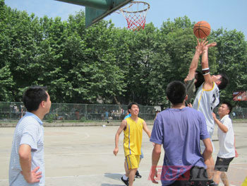 由于時間已經(jīng)到了中午,張老師決定讓每隊派3名隊員,以3個球定勝負,哪個隊先投進3個球就算勝出。這會兒,1204期學員面對1203期學員的挑戰(zhàn),派出了強勢的組合:一隊隊長徐飛飛,二隊隊長吳建國加上高大強壯的李振中,我們1203期的學員也毫不示弱,針對1204期的組合也派出了高手。裁判一聲哨響,比賽開始了。1204期學員實力雄厚,完全不給1203期學員機會,連進3個球,贏得了比賽。我們悲催的1203期學員完全沒有回過神來,直呼:“不過癮,還沒發(fā)揮出水平!周末有空再戰(zhàn)。”