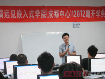 2012年8月6日,華清遠見教育科技集團成都中心12072期學員開學典禮在嵌入式實驗室805隆重舉行。參加本次開學典禮的老師有成都中心校長陶老師,教學部的潘老師、朱老師、姜老師,品質保障部的黃老師等。開學典禮由班主任張老師主持。