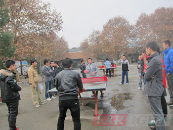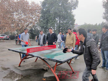 稍作休息之后,是激動人心的乒乓球決賽。經過淘汰賽,組長對本組成員的實力有了進一步的認識,由于是團體賽,出場的順序顯得尤其的重要。在周圍觀眾的加油助威聲中,比賽已經進行到了第三局,因為前兩局都由第三組獲勝,所以這一局對第一組成員來說顯得尤其的重要。而第三組的成員們更想贏了這場比賽,結束整個賽程。場上的比分一直咬的很緊,裁判盯著桌案上的小小乒乓球,小心的統計著分數。“賽點!”有人喊了出來,而大家的心也隨著這一聲叫喊,跟著緊張起來。終于,第一組扳回一局。接下來的一局,第三組派出了具實力的選手組長高磊,而第一組也派出了該組高手中的高手李癸佑。一場精彩的比賽正式上演。在眾人的加油聲,喝彩聲,歡呼聲中,第三組終于取得了乒乓球團體賽的勝利。