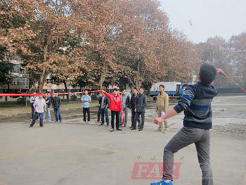 接著,進行的是羽毛球的自由組合比賽。考慮到時間的因素以及場地就近原則,就在乒乓球臺旁邊空出的停車場舉行,我們的學員別出心裁的拿出了活動橫幅拉起了一張會動的網,而我們的隊員有的是臨時組合,有的是經常在一起打球,這樣很快就淘汰了兩組,剩下了三組,進行輪賽,其中張鵬和丁明配合的很默契,連勝兩場,取得了羽毛球比賽的勝利。
