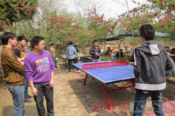 在輕松的氛圍中,時(shí)間慢慢的溜走。很快到了午飯時(shí)間,大家驅(qū)車來到幸福梅林的一農(nóng)家小院,院子里載滿了桃花,各居枝頭,爭奇斗艷。飯前,學(xué)員們有的坐在桃花叢中懶洋洋的曬著太陽,有的品著小茶,有的蕩著秋千,有的打起了乒乓球,好不愜意。飯點(diǎn)一到,大家迅速坐好,等著開飯。真是心情好,胃口就好,一大桌的農(nóng)家美食,漸漸見底。吃飽喝足,到小院兒里散散步,以助消化。