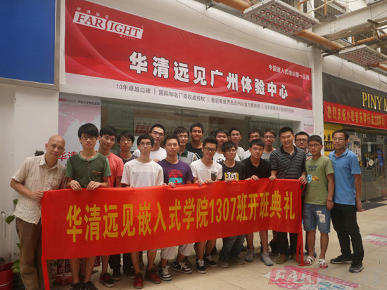 2013年7月22日,華清遠見廣州中心嵌入式Linux&Android就業班13071期的開學典禮在廣州大學城校區隆重舉行。出席本次開學典禮的有專程從北京趕來的華清遠見教育科技集團總裁、華清遠見教育科技集團院長季老師,華清遠見廣州分中心負責人古老師,華清遠見廣州分中心高級顧問梁老師,華清遠見教育科技集團講師牛老師、以及班主任李老師等。
