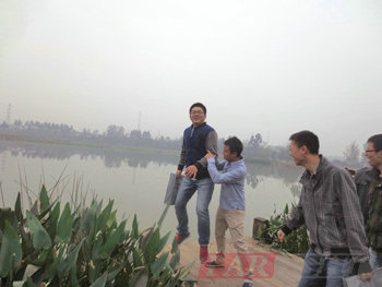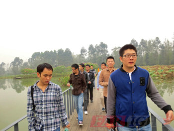 從花卉市場出來,大家一同來到了荷塘邊上。此時的荷葉已經凋零,映襯這徐徐秋風,顯得有點凄涼。但是,這并沒有影響大家游玩的心情,岸邊還是綠樹成蔭,紅花怒放。大家伙兒也很少見到那么大的池塘,走在塘邊,感受著秋風,也別有一番滋味。這時,路邊一個小孩子拿著一個小網在趴在池塘邊上網著什么,這個舉動也激發了這群大孩子的無限好奇,紛紛趴下來一探究竟。原來是一只巨大的蝌蚪,靜靜的呆在木板路下方。那小孩網不著也是著急,于是求助了旁邊的大哥哥們。此時,大哥哥們定是不負眾望,總算是逮到了那只大蝌蚪。更有貪玩者借了魚網,網上來幾只田螺,說要帶回去送給朋友。