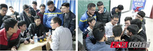 本次活動(dòng)大的主角莫過于華清遠(yuǎn)見自主研發(fā)的智能小車,這款小車說起來那可真是不簡單!在華清遠(yuǎn)見嵌入式課堂上就已經(jīng)受到了眾多學(xué)員的追捧。用戶不僅能利用Android手機(jī)通過無線網(wǎng)絡(luò)控制小車移動(dòng)、轉(zhuǎn)向,還能通過攝像頭采集視頻流,實(shí)時(shí)顯示在手機(jī)客戶端;通過Android手機(jī)控制端界面相應(yīng)操作進(jìn)行拍照,使用存儲(chǔ)設(shè)備進(jìn)行存儲(chǔ)。在現(xiàn)場(chǎng),華清遠(yuǎn)見講師苗老師首先向大家展示智能小車的強(qiáng)大功能,然后結(jié)合Linux、Andriod、嵌入式軟硬件開發(fā)等技術(shù),進(jìn)行了細(xì)致生動(dòng)地講解,并向大家介紹了當(dāng)前市場(chǎng)上相關(guān)的產(chǎn)品及設(shè)計(jì)趨勢(shì)。苗老師還介紹說,華清遠(yuǎn)見目前已經(jīng)開發(fā)出了智能手表、智能小車、智能手環(huán)、四旋翼飛行器、智能電視機(jī)頂盒等一系列智能產(chǎn)品,并已經(jīng)投入到教學(xué)中,通過真正的產(chǎn)品來學(xué)習(xí)開發(fā),讓學(xué)習(xí)更有趣。同學(xué)們聽的十分投入,并親手操縱小車感受其無窮的樂趣。