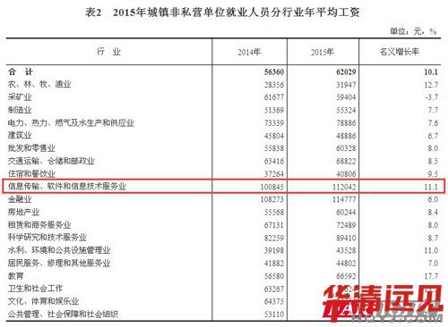 統計數據顯示,IT行業(信息傳輸、軟件和信息技術服務業)中,非私營單位年均薪資在各行業中排名第二,為112042元,名義增長率為11.1%,是全國平均水平的1.81倍;私營單位年均薪資在各行業中高,為57719元,名義增長率為13.1%,是全國平均水平的1.46倍!