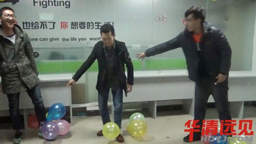 團團圓圓:6個人分為2隊都在左腳踝上綁著氣球,大家踩破對方的氣球,保護好自己的氣球,游戲開始,競爭還是很激烈的,大家都互踩起來了。