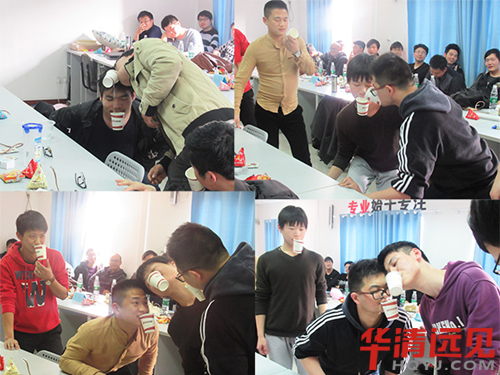 最為精彩的游戲就是“紙杯傳水”,同學(xué)們只能通過(guò)嘴將紙杯傳給下一位同學(xué),傳到最后,剩的水越多,得分也越高。雖說(shuō)大家也很努力,可是怎么感覺(jué)像在洗臉,地上灑的水不是一般的多啊。不管最后的成績(jī)?nèi)绾危蠹业慕铀藙?shì)還是很有看點(diǎn)的。