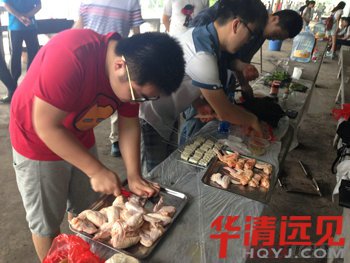 時間過的很快,中午12點了,大家回到自助燒烤區域,桌子上已經擺好了工具、飲料、食物、油鹽等作料,炭爐已經開始準備生火,洗完菜的同學把腌制好的雞翅、火腿也都一并串上,燒烤活動正式開始……