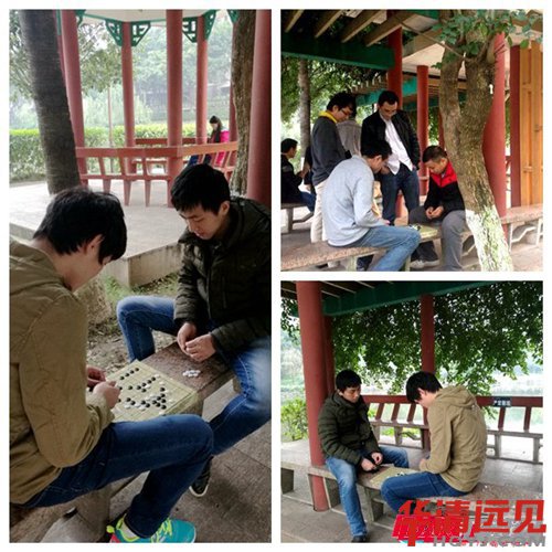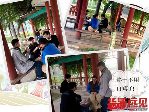 來到華清已有兩月之久,大家早已彼此熟悉,無需多言多語,一到便開始自發組隊游戲了。玩撲克的、下五子棋的、玩你來比劃我來猜的、閑逛看風景的、還有三三兩兩扎堆聊人生聊理想的,大家玩得不亦樂乎。順便說一下,下面那兩位扭秧歌的同學,我是不會承認他們是我的學生的,我不認識他們,不認識,不認識,重要的事情要說三遍!
