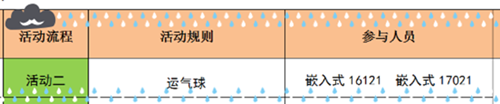 2人為一小組,4小組進行接力。2人不能用雙手抱球,只能用背部夾住2個氣球,從起點出發繞過終點的標槍再回到起點,然后把2個球傳給下一組的隊員,4小組輪換后,快的那一大組就是獲勝隊。