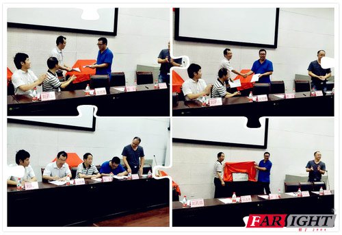 圖為:華清遠見易總監和桂電揭牌瞬間 10點過后,在眾多老師見證下,舉行華清遠見---桂電校企合作簽約儀式。會上,首先由雙方代表發言,描繪了華清---桂電合作的宏偉藍圖。然后,由雙方代表在協議書上簽字、交換協議。其次郭處長、黨主任與易總一起揭牌,其中有華清---桂電共建實驗室,共建創客學院等等牌匾。后,由易總進行實驗器材捐贈儀式。
