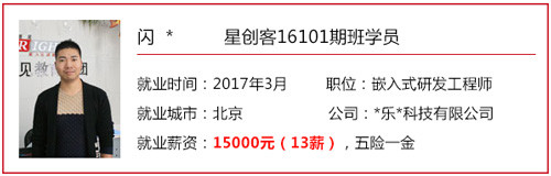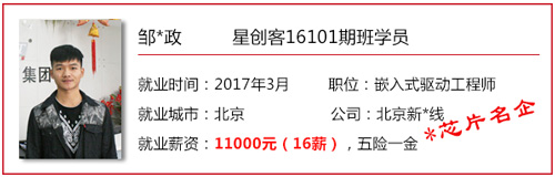 華清遠見星創客精英訓練營,一個匯集了眾多創客愛好者/技術精英的神奇地方,送走了一批又一批的高端嵌入式/Android底層開發人才。 目前,星創客16041期班(1期)已于2016年9月30日正式結業,就業率100%,高就業年薪19.2W,平均就業年薪14.4W; 星創客16071期班(2期)于2016年12月23日正式結業,就業率100%,高就業年薪20.4W,平均就業年薪15.6W。 而前不久,星創客3期班(16101期)也于2017年3月31日正式結業,畢業前夕,在就業老師的安排下,同學們參加了多個企業上門招聘會,收獲頗豐!截至畢業后的第20個工作日,全班就業率高達98%!(因為有兩三個小伙伴還是學生,所以申請了延期畢業呦~) 其中90%的小伙伴被名企高薪錄用,有月薪高達15k的大神,還有13薪、16薪的土豪!