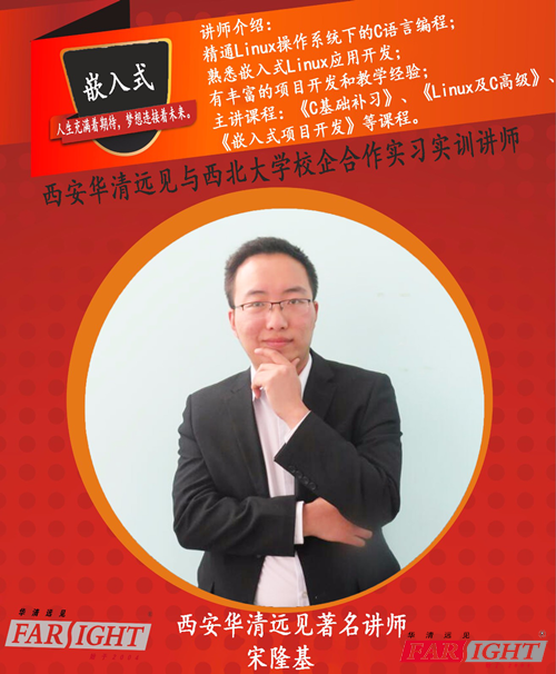 此次實(shí)習(xí)實(shí)訓(xùn)講師由西安華清遠(yuǎn)見著名講師宋隆基老師講解,宋老師有豐富的項(xiàng)目開發(fā)和教學(xué)經(jīng)驗(yàn),精通Linux操作系統(tǒng)下的C語言編程和Linux應(yīng)用開發(fā)。