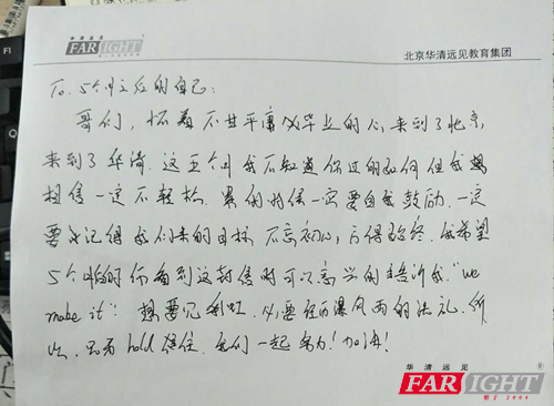 開(kāi)學(xué)典禮即將步入尾聲的時(shí)候,我發(fā)現(xiàn)一位學(xué)員已經(jīng)開(kāi)始給五個(gè)月后的自己寫的一封信了,信中是這樣說(shuō)的:
