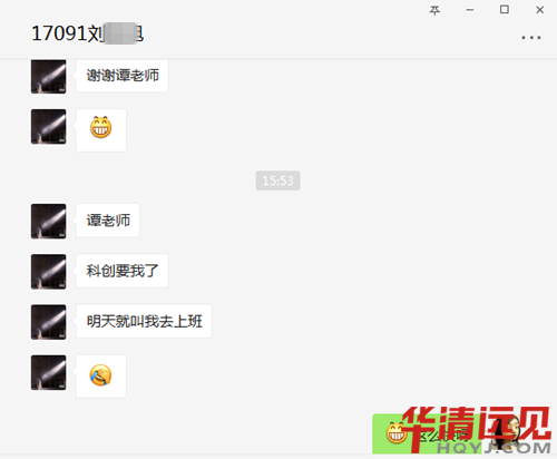 天道酬勤,努力終有收獲,劉校旭的成功離不開自己的刻苦勤奮,當然也離不開華清的悉心栽培。從對話截圖中可以看出他真的很感激在華清的這段自我升華的時光。