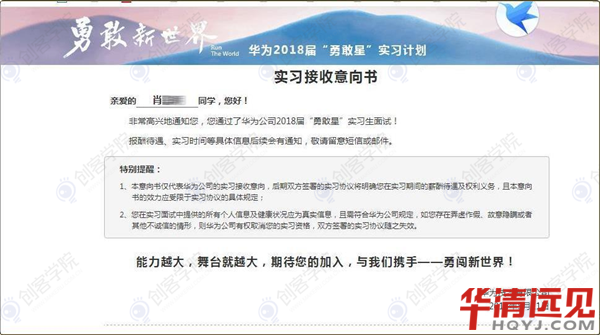 正如華為公司給肖同學(xué)“實(shí)習(xí)接收意向書”中寫到的那樣:“能力越大,舞臺(tái)就越大”想要提升自身是非常重要的一件事!所以別再猶豫了,來華清遠(yuǎn)見,你也可以成為能力大、受企業(yè)青睞的人!