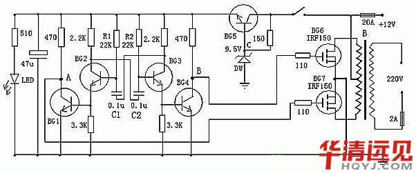 圖一為一種比較簡單切容易制作的逆變器原理圖,可以將12V直流電源電壓逆變為220V交流電。基本運行過程:BG2與BG3組成多諧振蕩器推動整個電路的運行,然后通過BG1和BG4來控制BG6和BG7工作。振蕩電路由BG5和DW組的穩壓電源供電,使得多諧振蕩器輸出的頻率穩定(多諧振蕩器的工作原理大家可以自行百度)。在制作時,變壓器可選有常用雙12V輸出的市電變壓器。可根據需要,選擇適當的12V蓄電池容量。蓄電池容量越大,工作時間越長。 ![]()
