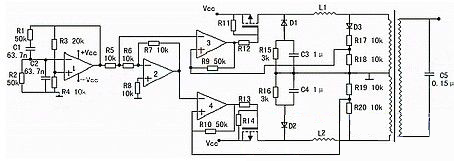 圖二是一款高效率的正弦波逆變器電路圖,該電路用12V電池供電。先用一片倍壓模塊倍壓為運放供電。可選取ICL7660或MAX1044。運放1產生50Hz正弦波作為基準信號。運放2作為反相器。運放3和運放4作為遲滯比較器。其實運放3和開關管1構成的是比例開關電源。運放4和開關管2也同樣。它的開關頻率不穩定。在運放1輸出信號為正相時,運放3和開關管工作。這時運放2輸出的是負相。這時運放4的正輸入端的電位(恒為0)總比負輸入端的電位高,所以運放4輸出恒為1,開關管關閉。在運放1輸出為負相時,則相反。這就實現了兩開關管交替工作。