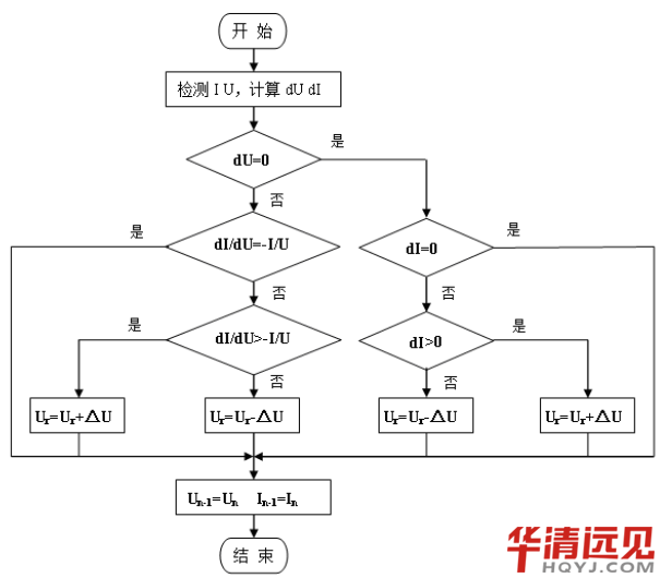 相同溫度,不同光照 擾動步長問題——考慮在變流器進入工作狀態后,其PN側電壓為較穩定的值,即使光照強度、環境溫度發生變化,光伏電池的最大功率點電壓的變動范圍不會很大。根據其采集回來的PN側電壓和光伏電池輸出電流,并計算和前一時刻的功率差值 ,根據電導增量法進行判斷,然后在目標跟蹤電壓上增加或減小一定的步長 。因為在光伏電池開始工作后,PN側電壓不是從0開始的,而是在光伏電池最大功率點對應電壓附近,所以 的值會比較小,K值的設置通過調試程序獲得,K暫定為5。 判斷精度問題——由導納法的工作流程圖(下圖)可以知道,在流程中存在 、 與0的關系的判斷,程序中總是會存在誤差,并且檢測中也會存在,如果以0為判斷準值,考慮實際應用中的誤差因素,用一個小的閥值來替代0。閥值暫定為0.1V和0.1A。