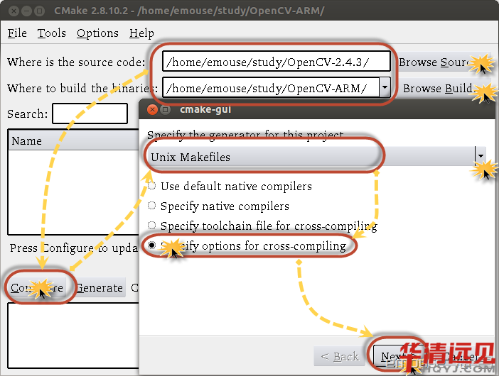 首先要看Opencv在嵌入式arm開(kāi)發(fā)的移植過(guò)程的話,網(wǎng)上有很多這方面的移植編譯方法都是比較老的,而且多數(shù)都是針對(duì)OpenCV 1.0的,他的方法很麻煩,很容易出錯(cuò),在這里我來(lái)說(shuō)一下我的方法,沒(méi)有那么麻煩,都是盡可能利用現(xiàn)成的工具,盡量圖形化界面配置操作,方便編譯配置。