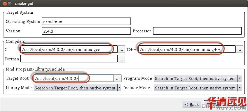 3、在下圖的界面中選擇交叉編譯工具鏈以及庫(kù)文件相關(guān)信息,按照?qǐng)D中的進(jìn)行填寫,其中紅框部分為交叉編譯工具鏈的實(shí)際路徑,根據(jù)宿主機(jī)實(shí)際安裝路徑填寫。
