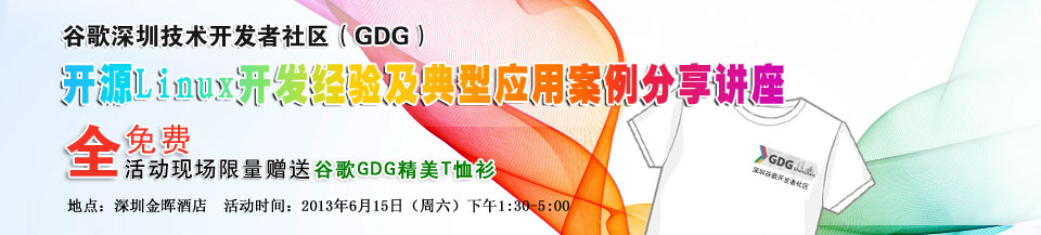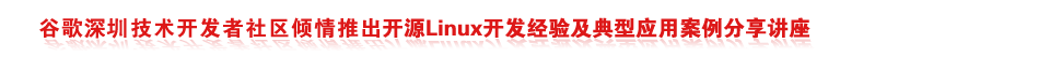 | 深圳谷歌開發者社區GDG(原谷歌技術用戶組GTUG),將于6月15日(周六)下午1:30-5:00,在深圳市長交流中心金暉酒店8樓金暉廳舉辦一場開源Linux開發經驗及典型應用案例分享講座,培訓講座中將通過三個專題與眾多開源Linux技術愛好者一起分享嵌入式Linux及Android開發的高級應用進階技術,以大家進入Linux開發高級應用領域。 活動限額100名,先到先得!我們將根據報名的先后順序、選擇場地能夠容納的人數給您發參加講座的確認信。若超出場地容納限制,我們會邀請這次不能來的朋友們參加我們未來舉辦的活動。后續深圳谷歌開發者社區將陸續舉辦同樣的活動,盡量滿足更多開發工程師和技術愛好者的需求,歡迎您來參加! |