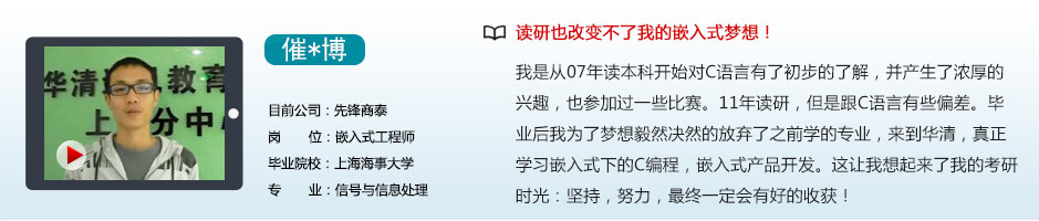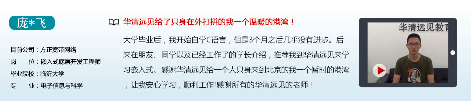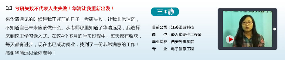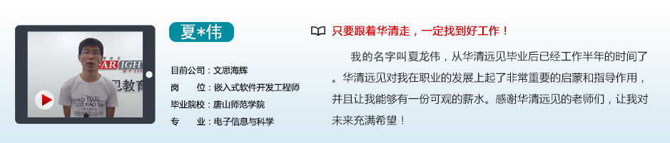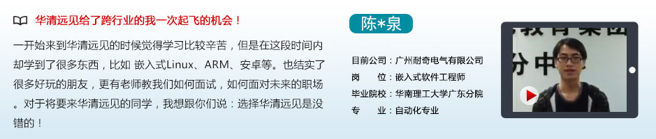 做技術支持工作以后,選擇轉行學嵌入式開發。告別萬元月薪工作,為了更多的發展從零開始學習。華清給你的不只知識,還提高你的學習能力!