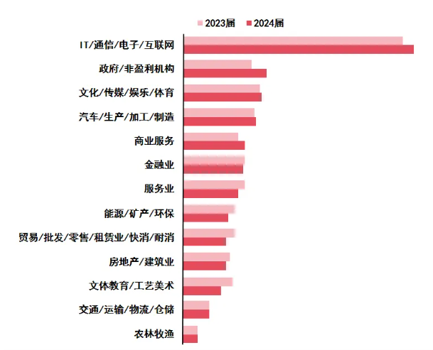 智聯招聘調研數據顯示,2024屆求職畢業生期望行業中,IT/通信/電子/互聯網、政府/非盈利機構、文化/傳媒/娛樂/體育行業位列前三,占比分別為26.4%、9.4%、8.9%。