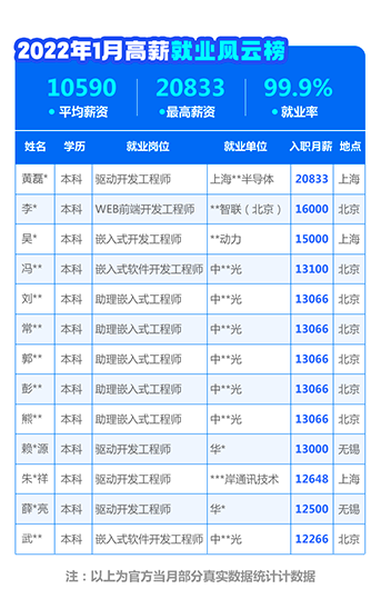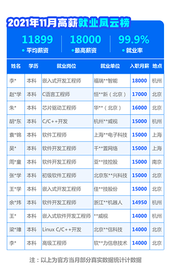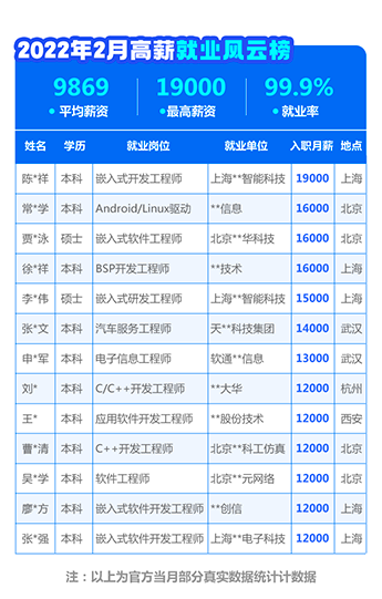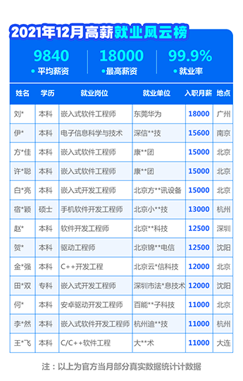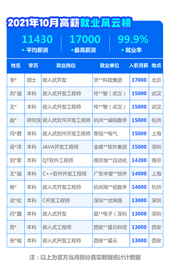 華清遠見在嵌入式行業內有著非常高的行業地位,我們和眾多嵌入式企業都建立有廣泛的用人關系。同時,華清遠見與全國20000+企業展開合作,一方面可以充分了解全國企業實際用人需求,為企業定向培養并輸送高端IT人才;另一方面,將名企技術研發實力與華清遠見人才培養優勢充分整合,將名企技術賦能IT行業人才培養體系。