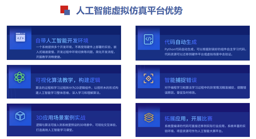 3、專為人工智能教學研發的虛擬仿真系統軟件、人工智能教學實驗平臺、人工智能工業互聯網實驗平臺等;