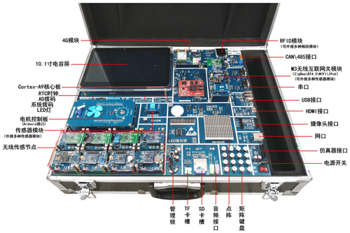 該嵌入式物聯網實驗平臺,包含開發板主板、設置在開發板主板上的CPU、通過總線與CPU相連接的GPU、音頻接口、ADC電位器、RTC、HDMI接口、陀螺儀、JTAG接口、酒精及瓦斯傳感器、RFID模塊、Zigbee模塊、GPRS模塊等一系列組件。它提供了豐富的板載資源以及擴展接口,傳感器種類多樣,搭配FS-JTAG仿真器,可以進行多種實驗。無論是用于教學、自學,還是項目研發,都是非常完善的開發平臺,可以很好的滿足實際應用的需求。目前,該嵌入式物聯網實驗平臺,已廣泛應用到高校物聯網實驗室建設。