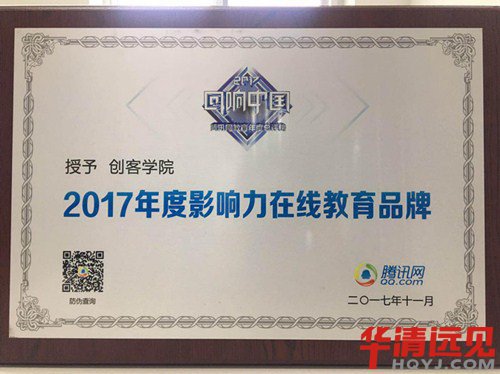 2017年11月22日,第十一屆“回響中國”騰訊網教育年度總評榜榮耀盛典在首都北京中國大飯店隆重舉行。華清遠見憑借其14年的行業專注度、雄厚的研發能力,優質的師資,適應企業需求的課程內容等獨特優勢,榮獲“2017年度影響力教育品牌 ”這一項大獎。此獎項的獲得是業內給予華清遠見十三年發展最好的肯定,也是華清遠見前進的動力。