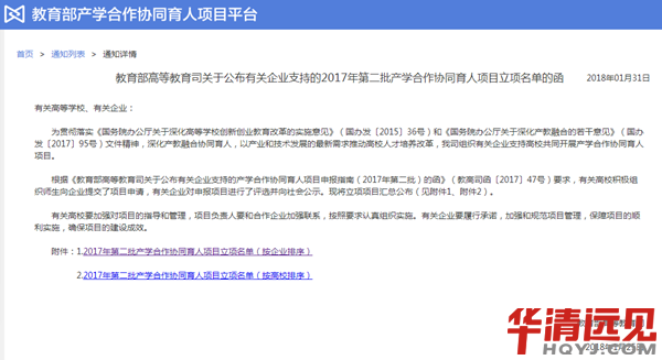 教育部高等教育司關于公布有關企業支持的2017年第一批產學合作協同育人項目立項名單的函網址鏈接: