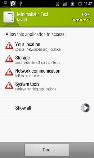 1. 在你安裝遇到的任何應(yīng)用程序之前,務(wù)必要閱讀許可協(xié)議的應(yīng)用程序訪問請求。這個常常被忽視的協(xié)議含有特定權(quán)限許可方面的寶貴信息,這些權(quán)限許可涉及應(yīng)用程序如何訪問你的設(shè)備。這些許可請求(如訪問GPS、聯(lián)系人資料、外部存儲介質(zhì)等)都直接編寫到安卓清單文件。要留意應(yīng)用程序聲稱進行什么操作、實際上進行什么操作。計算器應(yīng)用程序很可能不需要訪問互聯(lián)網(wǎng)或你的個人信息,所以要仔細閱讀那些許可協(xié)議。