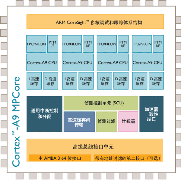 ARM Cortex-A9 MPCore 多核處理器集成了經驗證非常成功的 ARM MPCore 技術以及更多增強功能,以此簡化了多核解決方案,并使其應用范圍得到擴展。Cortex-A9 MPCore 處理器可提供史無前例的可擴展的高性能,同時還支持靈活設計和新功能,從而進一步降低和控制處理器和系統級的能耗。借助 Cortex-A9 MPCore 處理器的定向實現,移動設備的高性能還可在現在的解決方案的基礎上不斷提高,具體方法是:利用設計靈活性和 ARM MPCore 技術提供的高級功率管理技術,在散熱受限以及移動電源預算緊張的情況下維持運行。使用可伸縮的高性能,該處理器可超過現今類似的高性能嵌入式設備的性能,并可在拓寬市場的基礎上進行穩定的軟件投資。