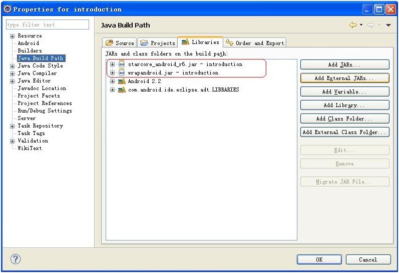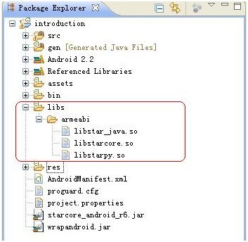 c. 將庫文件starcore_android_r6.jar和wrapandroid.jar到工程目錄下,將這兩個文件加入到工程中,如下圖: