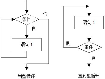 循環(huán)結(jié)構(gòu)的執(zhí)行過程如圖1.3所示,這種結(jié)構(gòu)有兩種形式:當(dāng)型循環(huán)和直到型循環(huán)。當(dāng)型循環(huán)首先判斷條件是否成立,若條件成立則執(zhí)行循環(huán)內(nèi)的語句,若條件不成立則直接跳出循環(huán);直到型循環(huán)是直接執(zhí)行循環(huán)內(nèi)的語句,直到條件不成立時(shí)退出循環(huán)體。