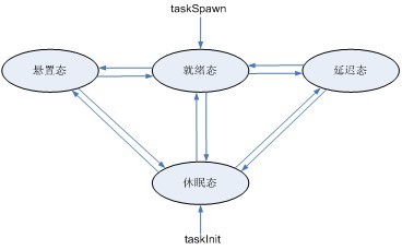 在VxWorks中,任務的基本狀態分為5種:就緒態、休眠態、延遲態、懸置態、運行態。 就緒態是指,任務已經獲得除了CPU之外的所有其他資源,所等待的只是CPU的運行,一旦其他任務釋放了CPU資源,該任務就可以開始運行。 休眠態表示任務正在等待除CPU之外的其他資源,即使當前CPU資源可以使用該任務也無法運行,通常也叫作阻塞狀態。 處于延遲態的任務表示在其執行期間主動放棄了CPU資源并處于一種等待延遲時間的狀態,這種任務不需要獲取任何資源,所需要等待的僅僅是一段時間。 懸置態是一種用于調試的狀態,處于這種狀態的任務不會因為其不運行而導致狀態的轉換。 整個系統中處于運行態的任務只能有一個(單核心系統),這樣的任務不缺少任何資源,也不需要等待時間延遲,通常其是由高優先級的就緒態任務轉換而來的。如果所有用戶任務都不能處于就緒狀態,系統將會運行一個IDLE任務。 除了這些基本狀態之外,根據不同的組合還可以列出下面的狀態:延遲態+S、懸置態+S、懸置態+T、懸置態+S+T以及帶有繼承優先級處于任何狀態的任務(也就是延遲態、休眠態、懸置態三者之間的組合)。 表1.1中列出了VxWorks中任務可能出現的狀態,每個狀態的后面都有一個簡要地說明。圖1.1給出的任務基本狀態轉換圖中描繪了任務基本狀態的轉換以及狀態之間的關系。 表1.1 任務狀態