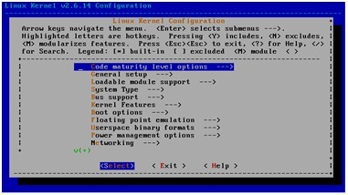 2.內核編譯 (1)下載內核源碼。 從//www.kernel.org/pub/Linux/kernel/v2.6/Linux-2.6.14.tar.bz2下載Linux-2.6.14內核(或者更高的版本)至/source/kernel目錄。解開壓縮包,并進入內核源碼目錄,具體過程如下: $ tar jxvf Linux-2.6.14.tar.bz2 (2)修改內核目錄樹根下的Makefile,指明交叉編譯器: $ vim Makefile 找到ARCH和CROSS_COMPILE,修改: ARCH = arm (3)設置環境變量: $ export PATH=$PATH:/usr/local/arm/3.3.2/bin (4)配置內核產生.config文件: $ cp arch/arm/configs/smdk2410_defconfig .config (5)輸入內核配置命令,進行內核選項的選擇,命令如下: $ make menuconfig 命令執行成功以后,會看到如圖1.6所示的界面。其實我們在圖1.5中看到過同樣功能的界面,那個圖也是內核選項配置界面,只不過那個界面在X-window下才能執行。