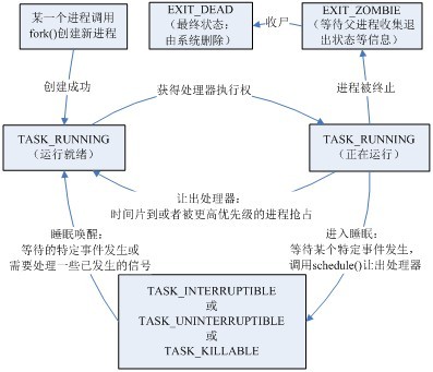 進程不但包括程序的指令和數據,而且包括程序計數器和處理器的所有寄存器及存儲臨時數據的進程堆棧,因此正在執行的進程包括處理器當前的一切活動。 因為Linux是一個多進程的操作系統,所以其他的進程必須等到系統將處理器使用權分配給自己之后才能運行。當正在運行的進程等待其他的系統資源時,Linux內核將取得處理器的控制權,并將處理器分配給其他正在等待的進程,它按照內核中的調度算法決定將處理器分配給哪一個進程。 內核將所有進程存放在雙向循環鏈表(進程鏈表)中,其中鏈表的頭是init_task描述符。鏈表的每一項都是類型為task_struct,稱為進程描述符的結構,該結構包含了與一個進程相關的所有信息,定義在<include/linux/sched.h>文件中。task_struct內核結構比較大,它能完整地描述一個進程,如進程的狀態、進程的基本信息、進程標識符、內存相關信息、父進程相關信息、與進程相關的終端信息、當前工作目錄、打開的文件信息、所接收的信號信息等。 下面詳細講解task_struct結構中為重要的兩個域:state(進程狀態)和pid(進程標識符)。 1)進程狀態 Linux中的進程有以下幾種狀態。 它們之間的轉換關系如圖3.2所示。